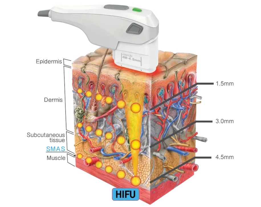 HIFU directs focused ultrasound energy to specific layers of skin, bypassing the surface to reach deeper tissue. The ultrasound waves generate controlled heat at various depths, which encourages collagen and elastin production within the skin's structural layers. This process triggers a tightening effect as the skin gradually lifts and firms over time.